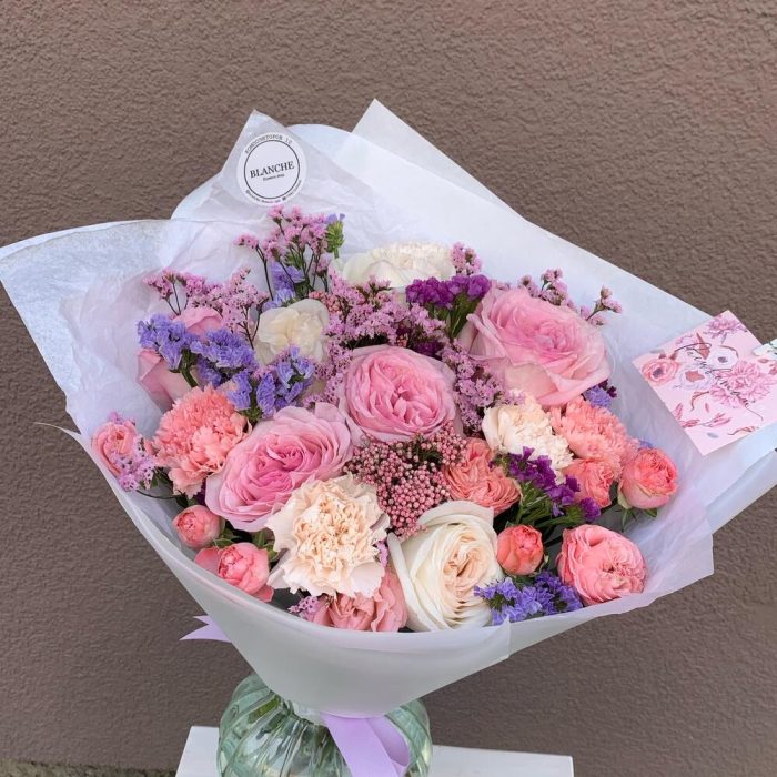 Pink O’Hara роза – 4 шт.white o’hara – 3 шт.кустовая роза madam bombastic – 2 шт.диантусы сортовые – 5 шт.Озотамнус розовый – 2 шт.Лимониум – 9 шт.Фирменная упаковка – 1 шт.