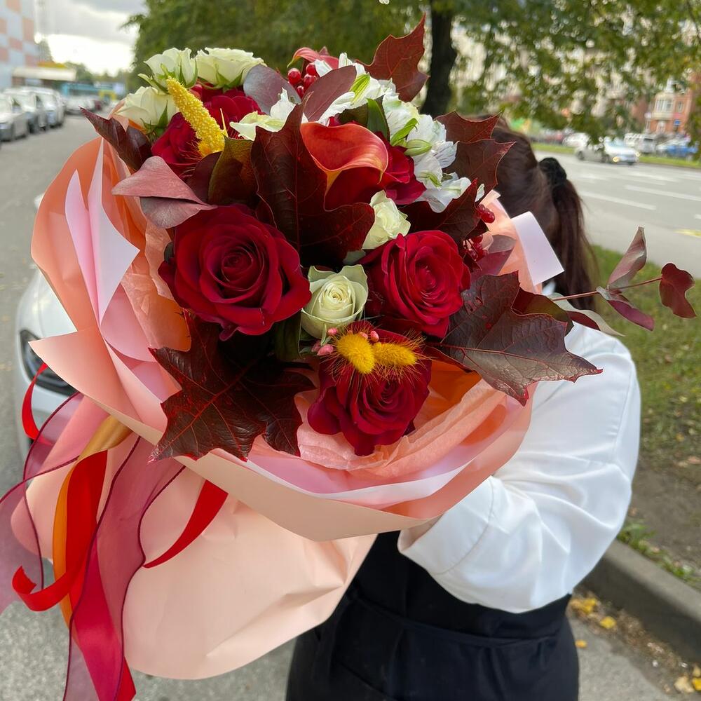 Альстромерия – 3 шт.Гиперикум – 2 шт.Калла – 1 шт.Лента – 4 шт.Роза красная – 5 шт.Роза кустовая – 3 шт.Тишью – 4 шт.Пленка – 2 шт.Сухоцветы – 3 шт.Листья Дуба – 3 шт.Лагурус – 5 шт.роза белая кения – 4 шт.