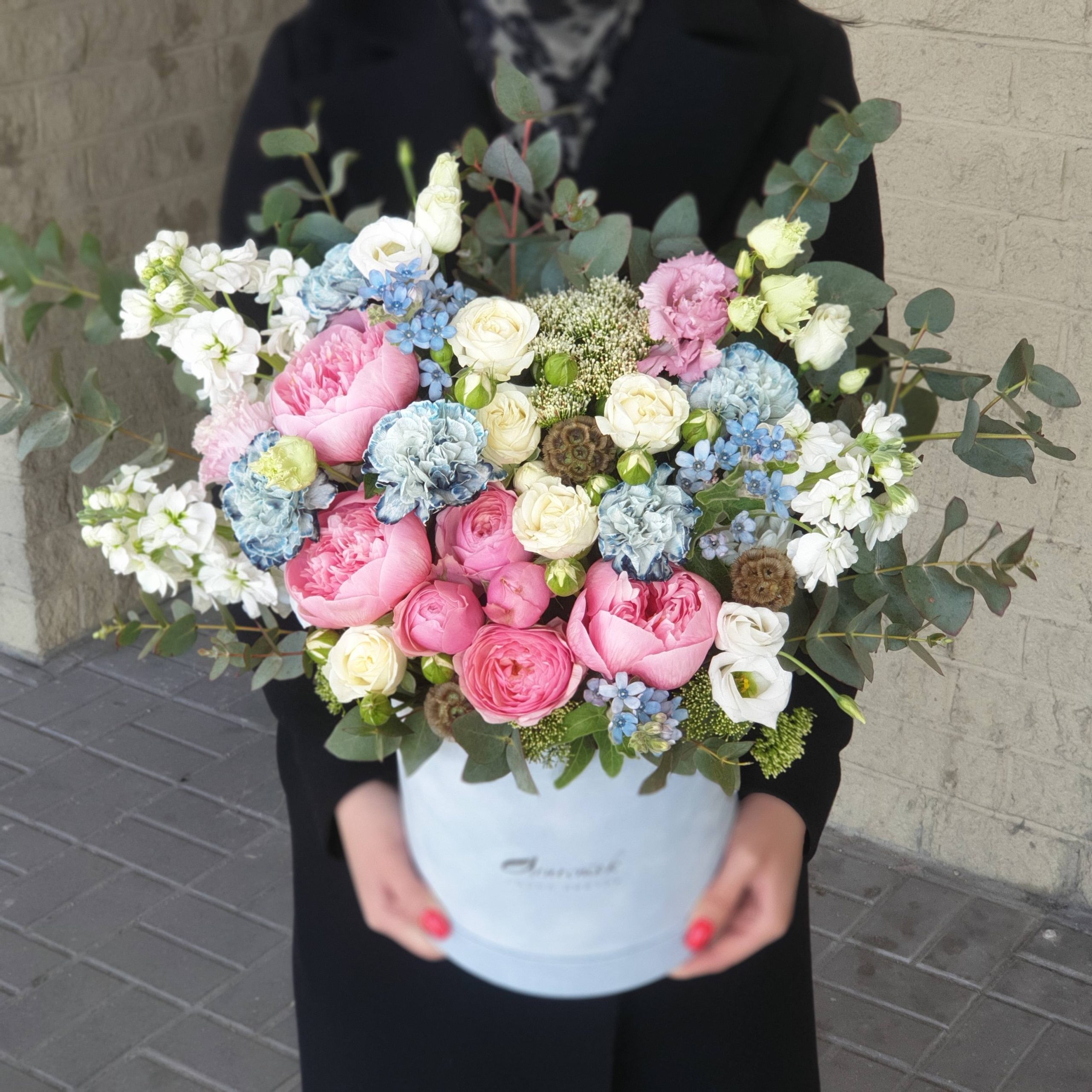 Бархатный цилиндр из голубых диантусов, розовых пионов и ароматной маттиолы