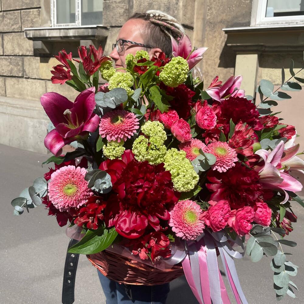 Пион – 7 шт.Лилия – 4 шт.Гермини – 8 шт.Альстромерия – 11 шт.Вибурнум – 2 шт.джульетта кустовая роза пионовидная – 5 шт.Эвкалипт – 4 шт.Оазис флористический – 4 шт.Корзина плетеная – 1 шт.Лента атласная – 4 шт.