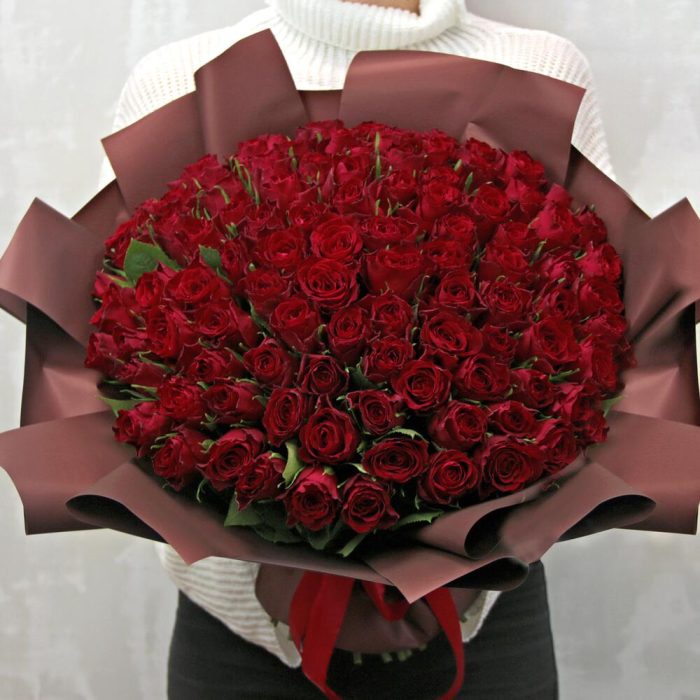 Букет из 101 красной розы 35-40 см (Кения) в стильной упаковке
