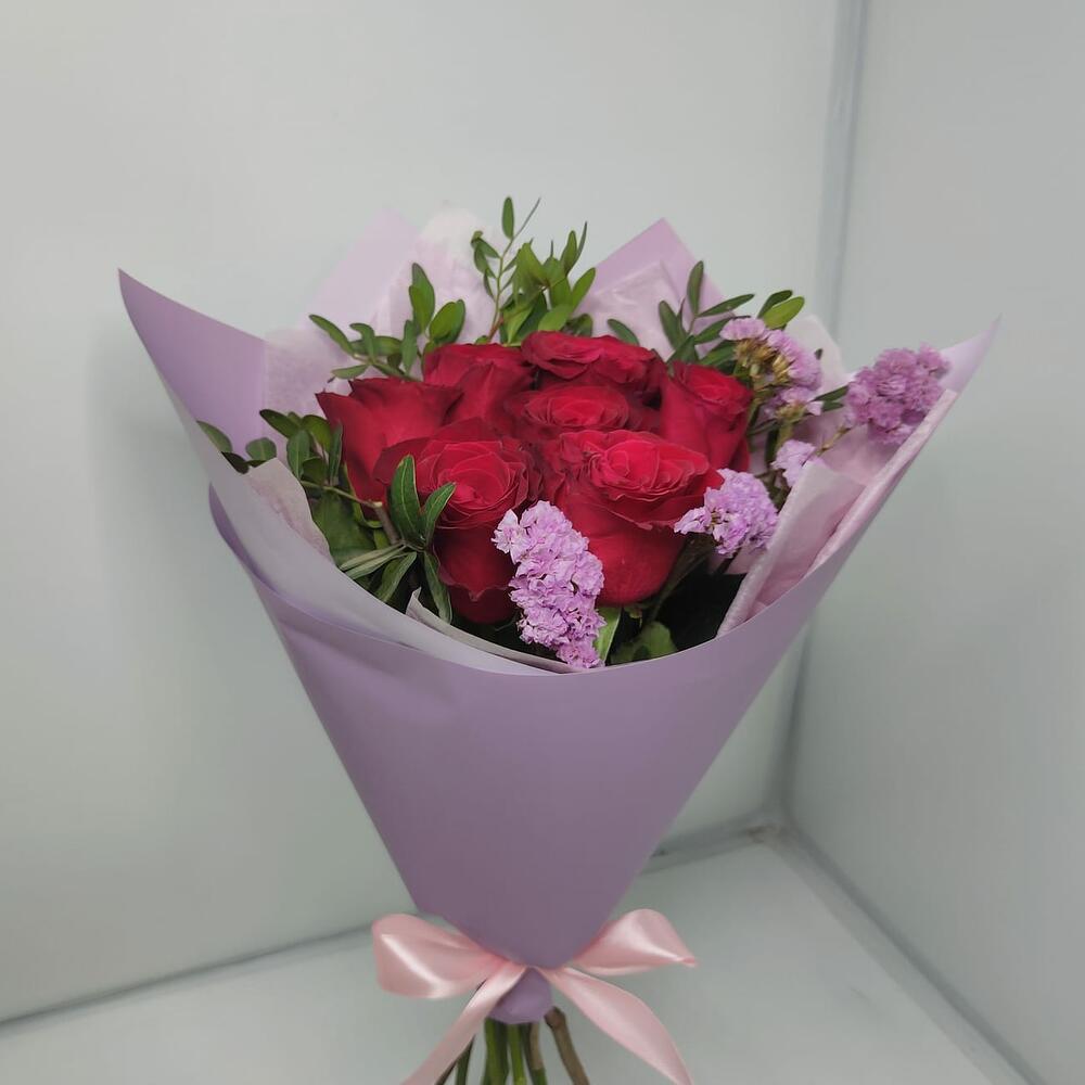 Роза эквадор 50 см – 7 шт.Статица – 1 шт.зелень фисташки – 1 шт.Дизайнерская упаковка – 1 шт.