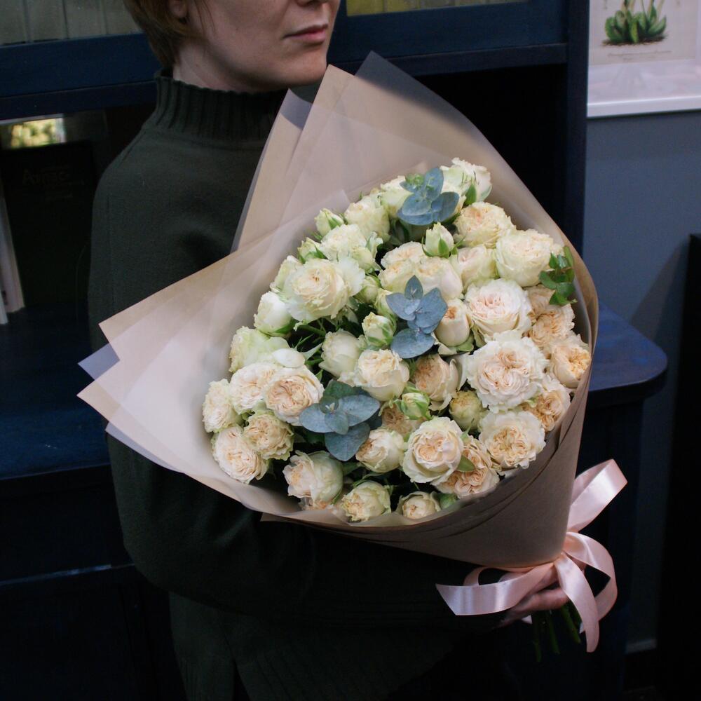 Букет из 9 кремовых кустовых пионовидных роз с эвкалиптом