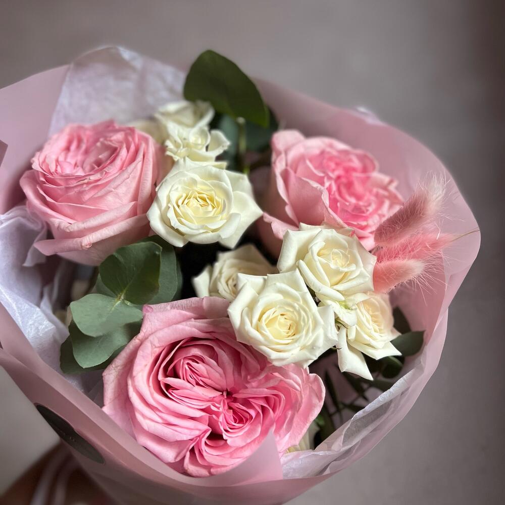 pink o’hara роза – 3 шт.Кустовая роза – 2 шт.Эвкалипт – 2 шт.Лагурус – 3 шт.декоративная упаковка – 1 шт.Атласная лента – 1 шт.