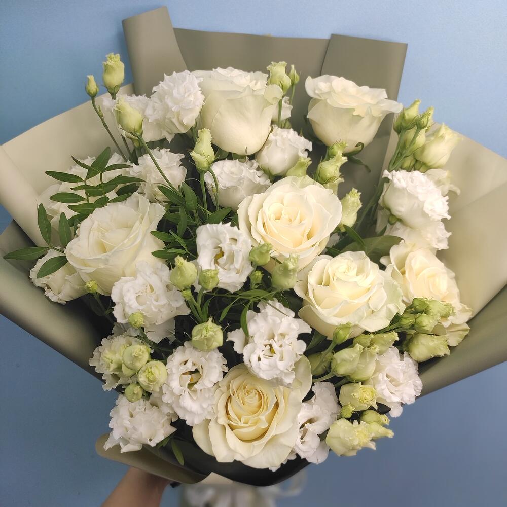 Букет из роз и эустом с фисташкой