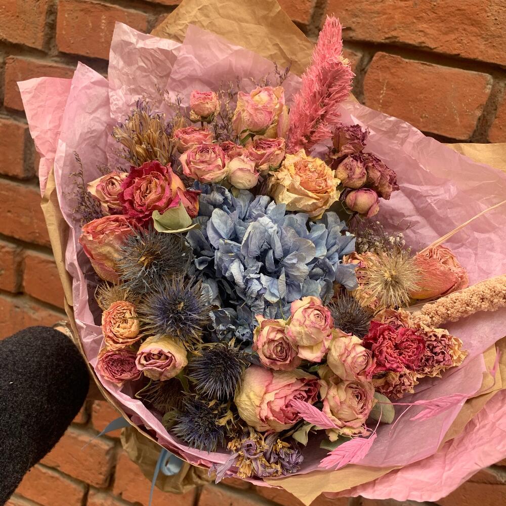 Гортензия – 1 шт.Роза кустовая – 3 шт.Роза – 1 шт.Эрингиум синий – 2 шт.
