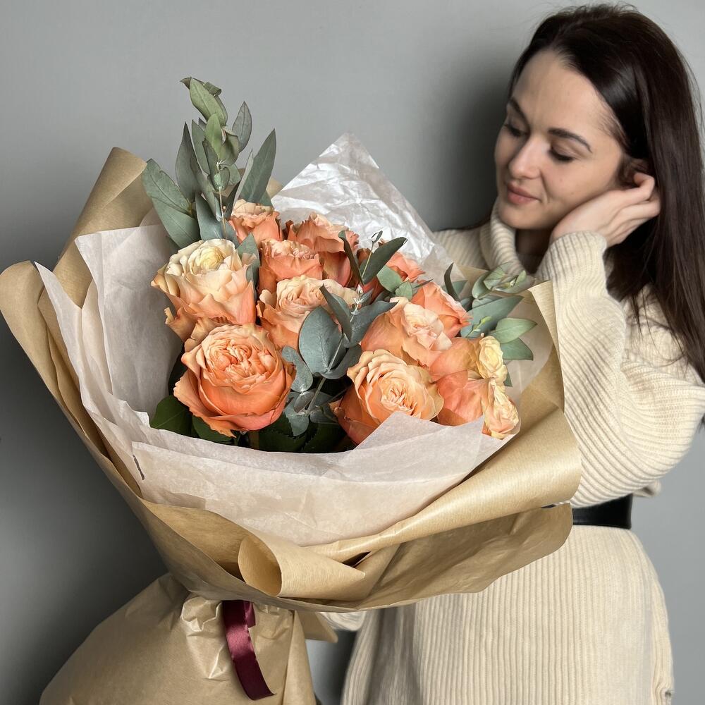 роза кахала 60 см – 13 шт.Эвкалипт – 8 шт.Упаковка – 4 шт.Лента атласная – 2 шт.
