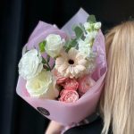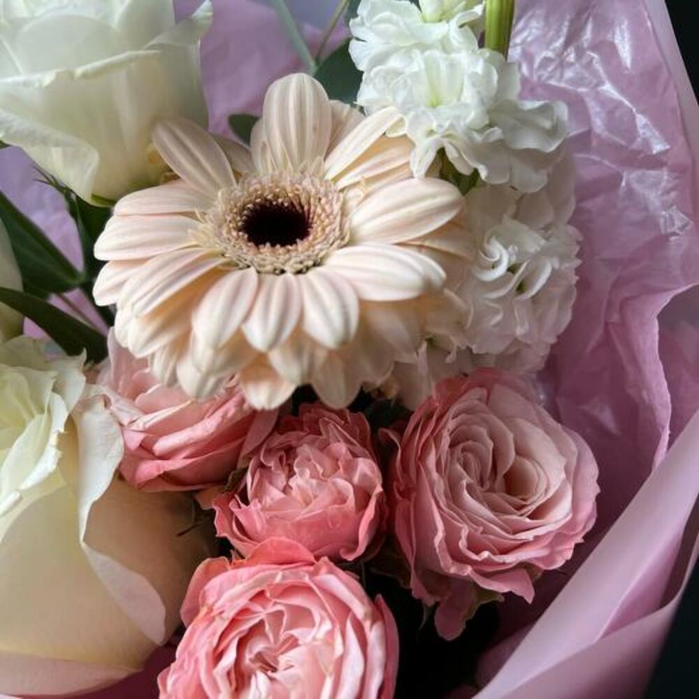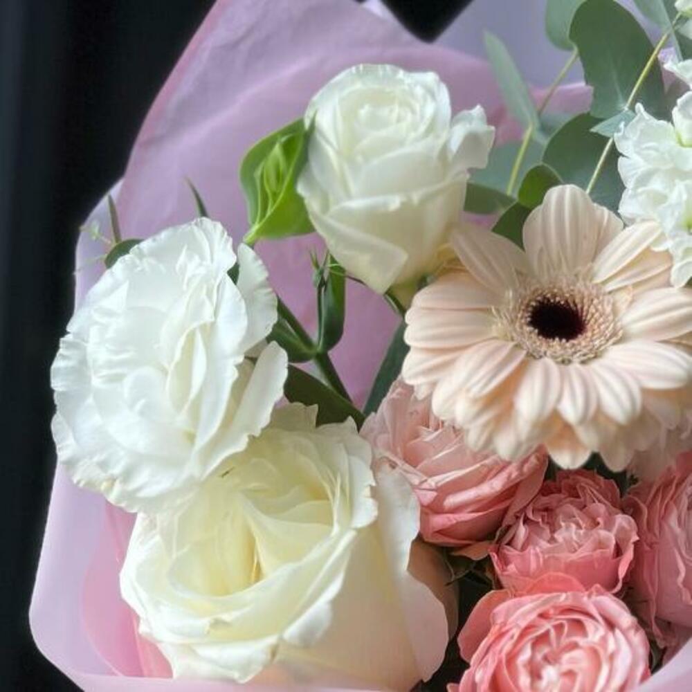 Гербера – 1 шт.Кустовая пионовидная роза – 1 шт.Одноголовая роза – 1 шт.Маттиола – 1 шт.Лизиантус – 1 шт.Эвкалипт – 1 шт.декоративная упаковка – 1 шт.Атласная лента – 1 шт.