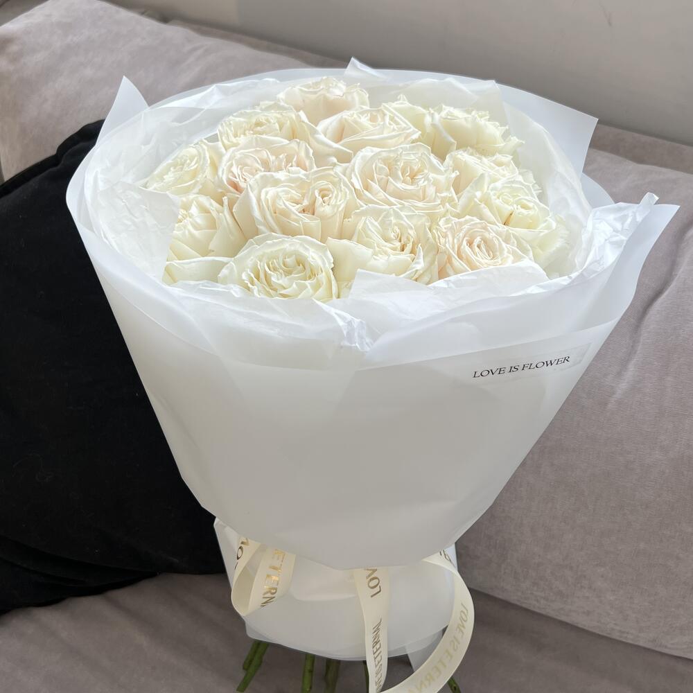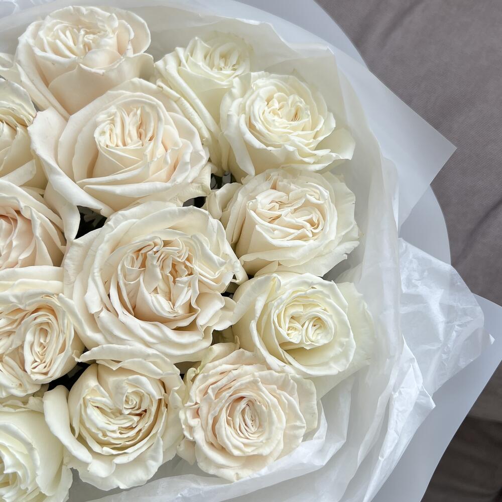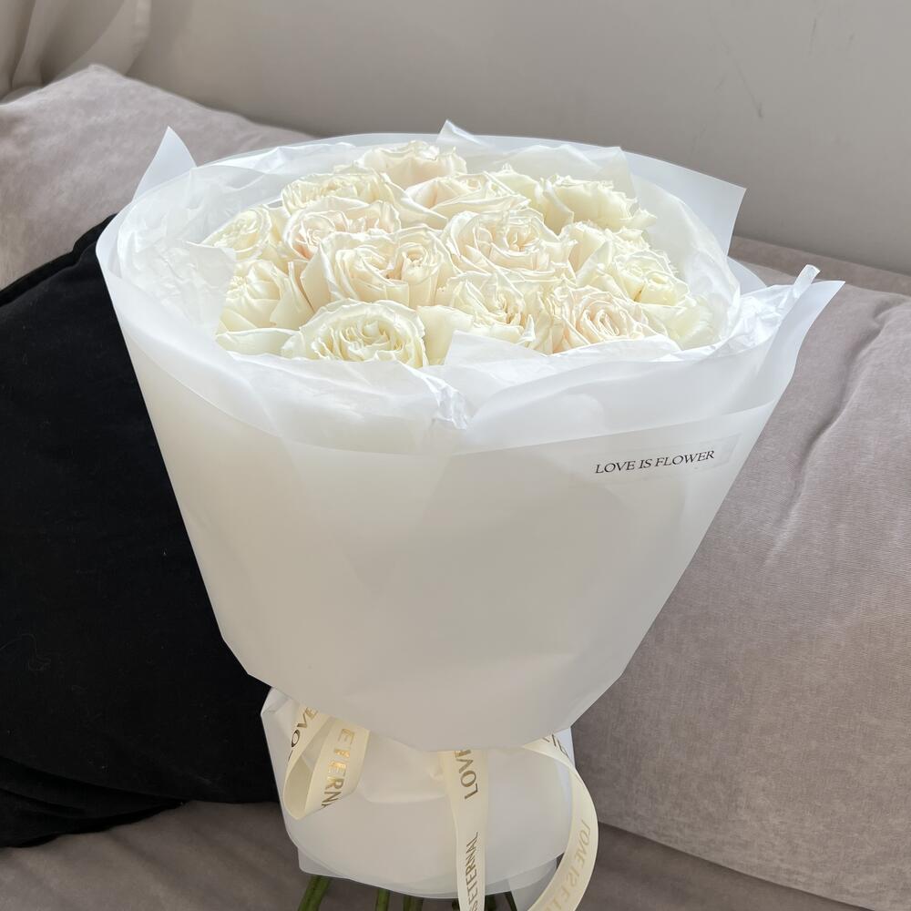 Роза белая – 15 шт.тишью белая хрустящая – 1 шт.пленка матовая белая полупрозрачная – 1 шт.открытка брендированная в подарок – 1 шт.