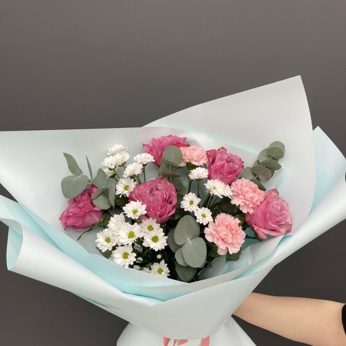 Альстромерии, Гвоздики, Кустовые розы, Лизиантусы, Розы, Хризантемы