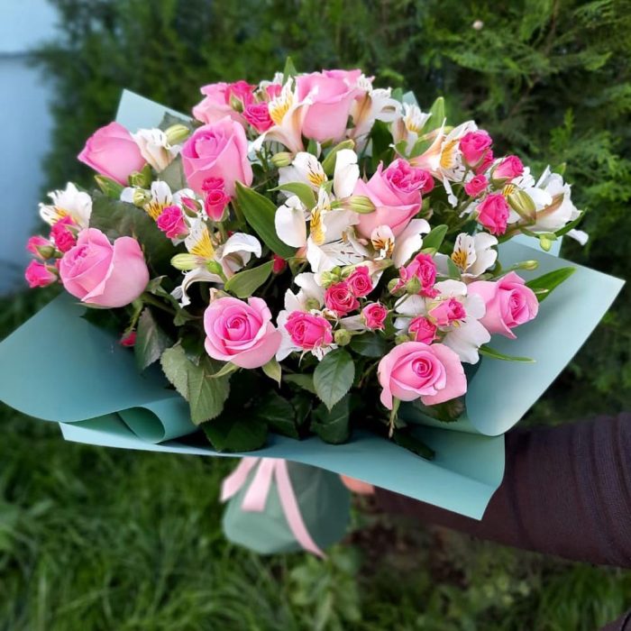 Роза розовая – 11 шт. Альстромерия белая – 5 шт. Роза кустовая розовая – 5 шт. Упаковка матовая пленка – 1 шт.