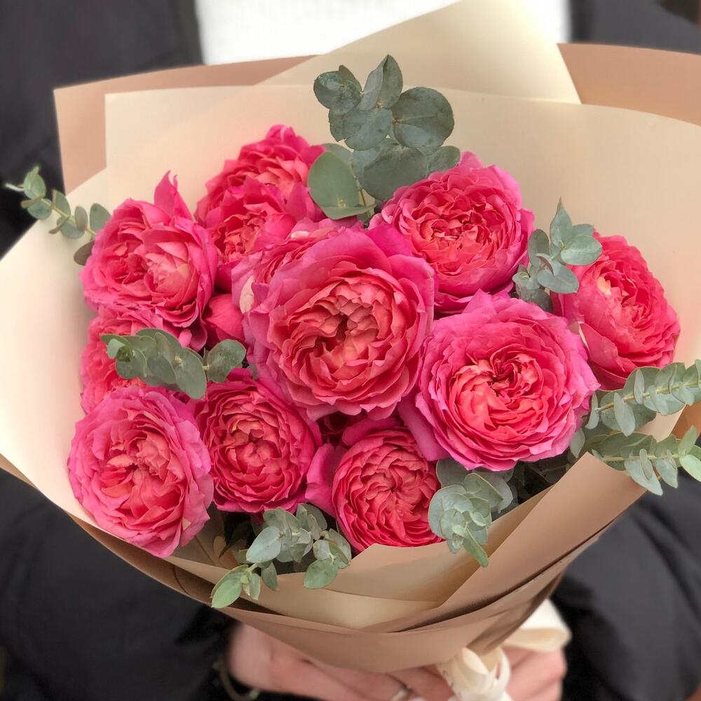 Пионовидная кустовая роза – 3 шт.Эвкалипт – 3 шт.Дизайнерская упаковка – 1 шт.транспортировочная упаковка – 1 шт.