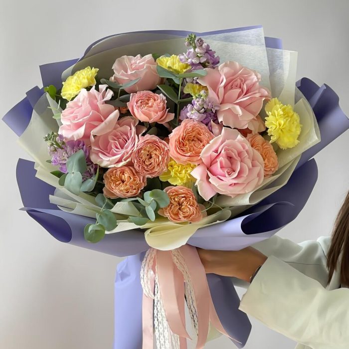 Лента – 2 шт.Маттиола – 3 шт.Эвкалипт – 2 шт.Роза одноголовая – 5 шт.Гвоздика – 5 шт.Упаковка дизайнерская – 2 шт.Кризал (подкормка) – 2 шт.Открытка мини – 1 шт.Роза кустовая джульетта – 3 шт.
