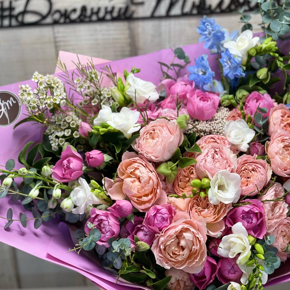 роза кустовая пионовидная «джульетта» – 5 шт.роза кустовая пионовидная «джульетта принцесса» – 9 шт.Фрезия белая – 9 шт.Озотамнус – 1 шт.Хелеборус – 2 шт.Ваксфлауэр белый – 1 шт.Дельфиниум голубой – 4 шт.Эвкалипт – 10 шт.Подарочная упаковка – 1 шт.Лента атласная – 4 шт.