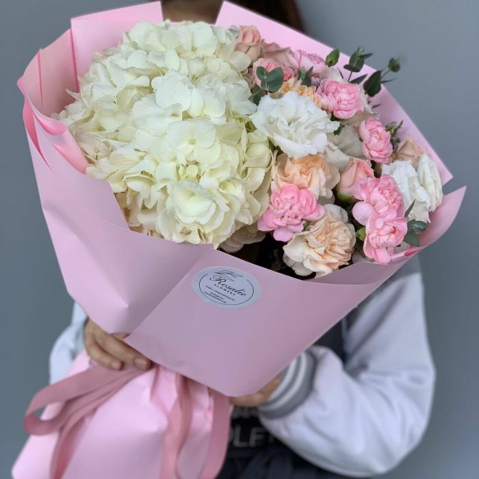 Альстромерии, Гвоздики, Кустовые розы, Лизиантусы, Розы, Хризантемы
