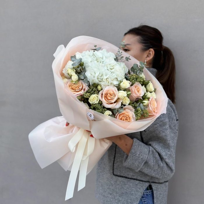 Изысканный букет из белой гортензии и роз в нежных оттенках.
