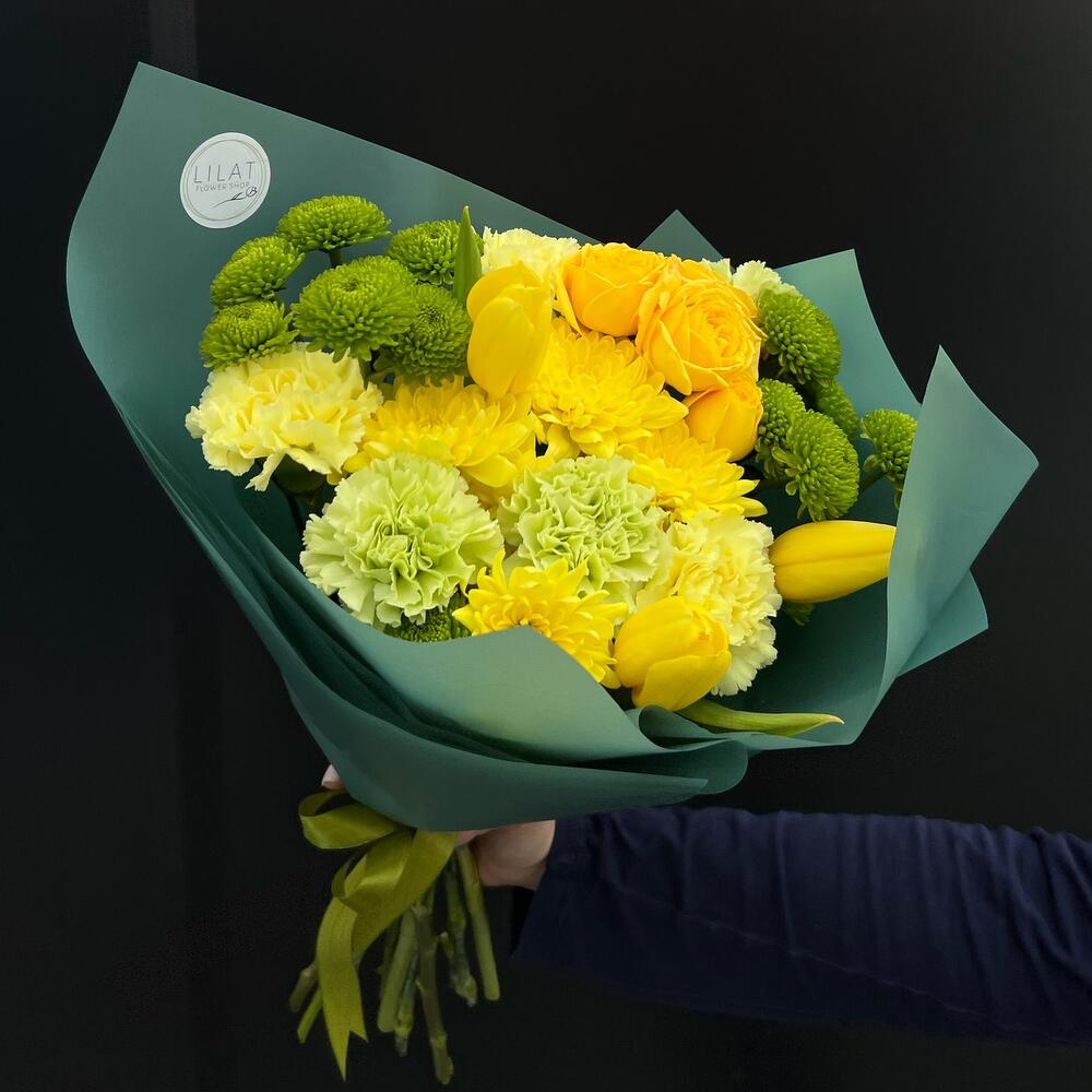 Тюльпан – 3 шт. Хризантема кустовая – 5 шт. Диантус – 5 шт. Упаковка дизайнерская – 3 шт. Открыточка с вашими пожеланиями – 1 шт. инструкция по уходу за цветами – 1 шт. куст роза – 1 шт.