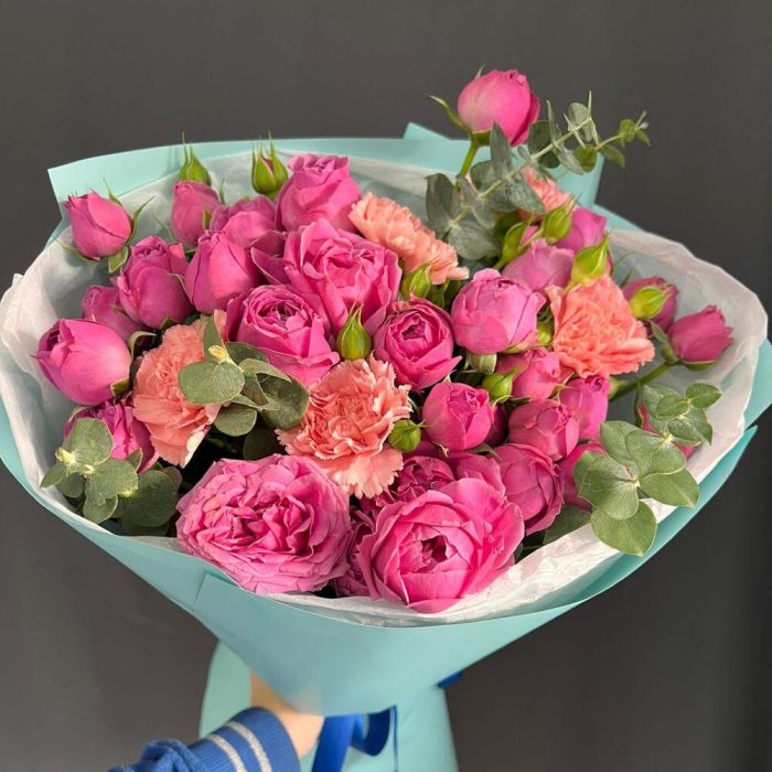 Гвоздики, Лизиантусы, Розы, Тюльпаны