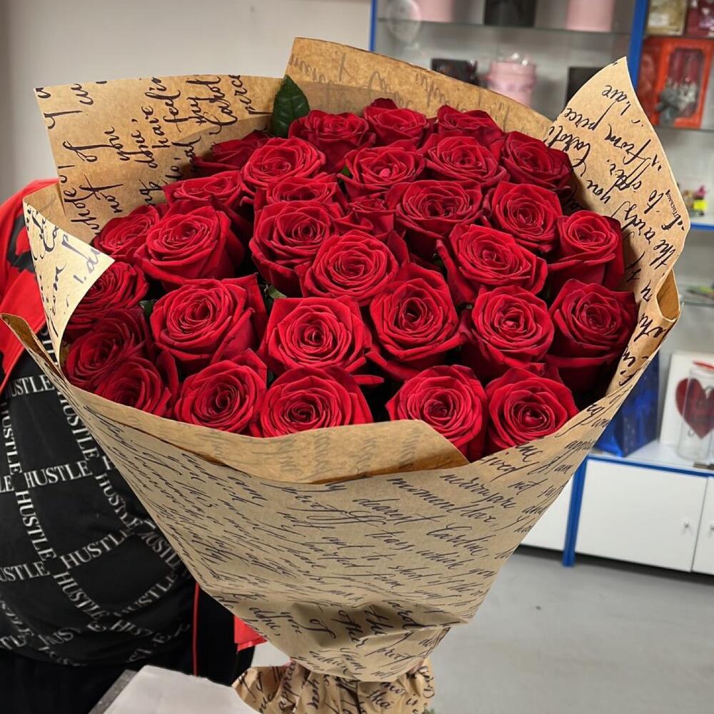 розы 27 штук 70 см – 27 шт.Крафт дизайнерский – 2 шт.Лента атласная – 1 шт.
