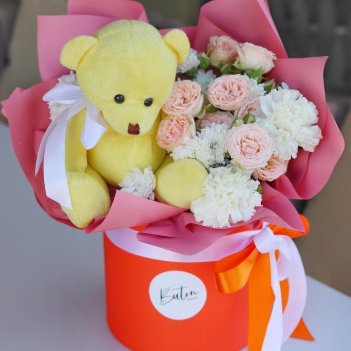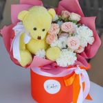 Роза кустовая – 1 шт.Гвоздика – 3 шт.Сантини – 2 шт.Фисташка – 1 шт.Мишка плюшевый – 1 шт.Шляпная коробка – 1 шт.Лента атласная – 1 шт.Открыточка с вашими пожеланиями – 1 шт.Шоколадка – 1 шт.