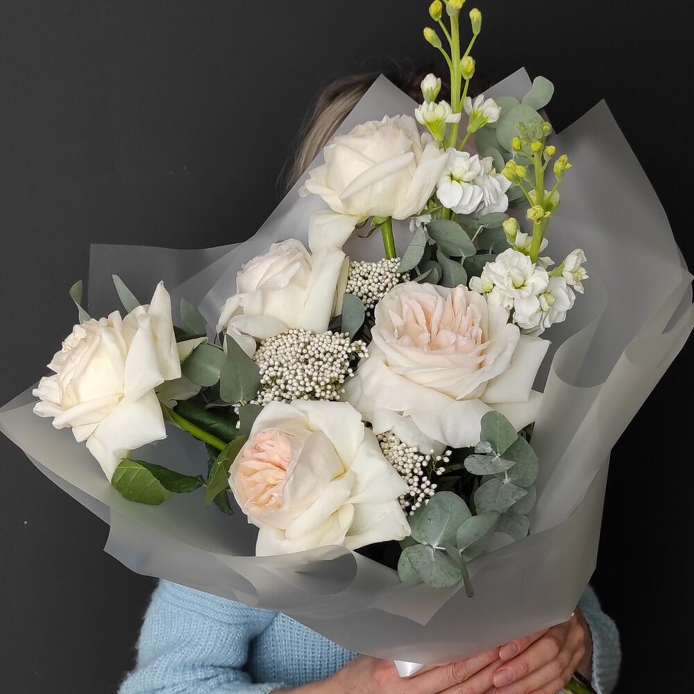 Маттиола – 2 шт.Озотамнус – 3 шт.Эвкалипт – 3 шт.Роза Эквадор – 5 шт.Упаковка дизайнерская – 2 шт.