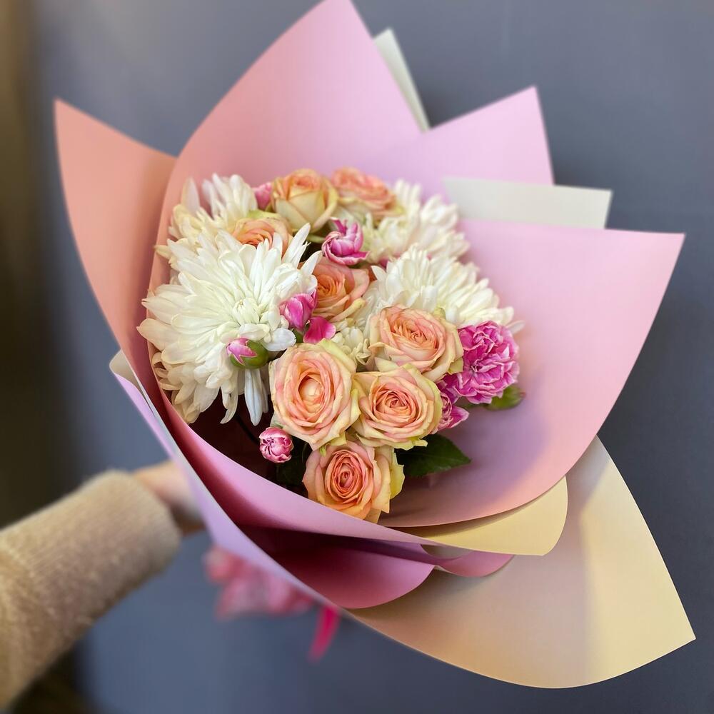 Хризантема кустовая – 2 шт.Кустовая роза – 2 шт.Гвоздика кустовая – 4 шт.Упаковка дизайнерская – 1 шт.Лента атласная – 1 шт.