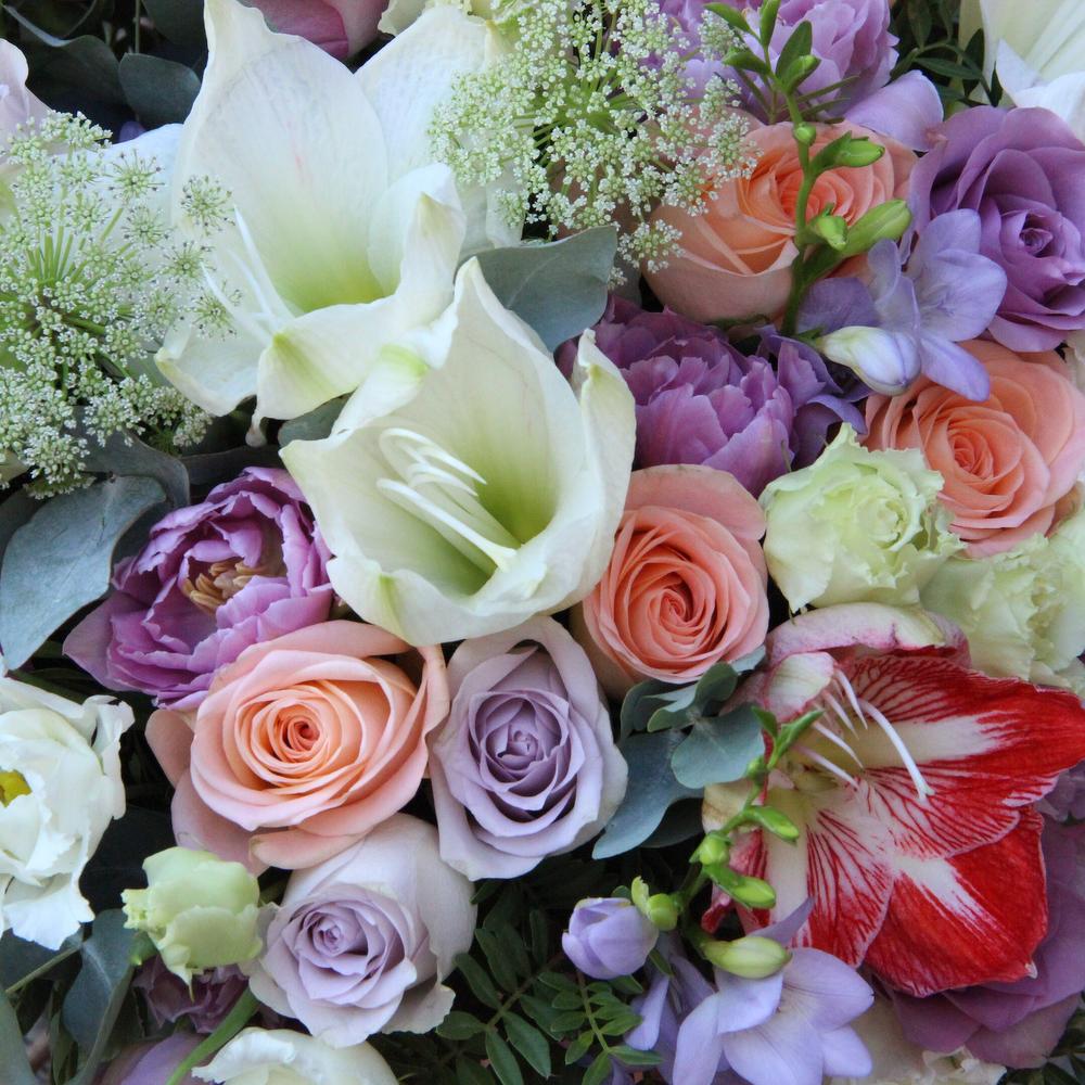 Амариллис – 5 шт.Роза Эквадор – 15 шт.Фрезия – 9 шт.Амми – 5 шт.Лизиантус – 11 шт.Эвкалипт – 11 шт.Фисташка – 7 шт.Тюльпан – 9 шт.Лента атласная – 3 шт.