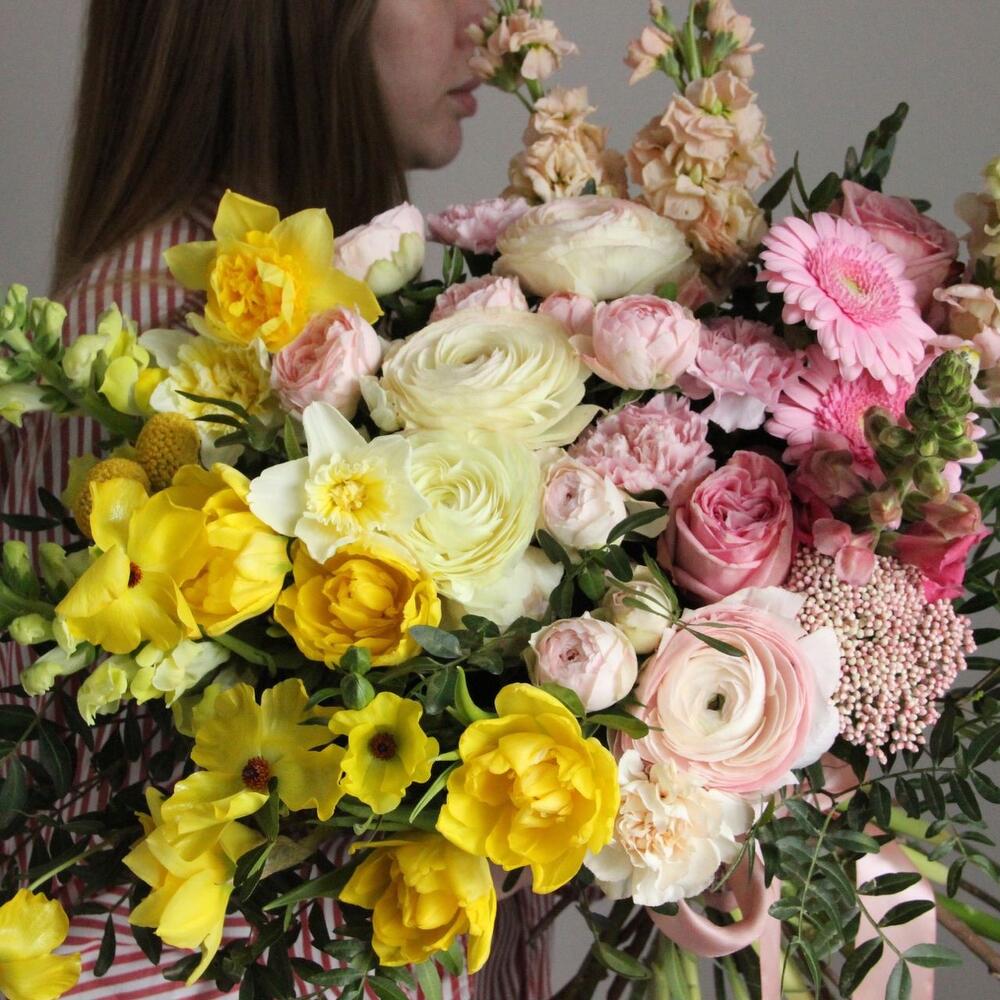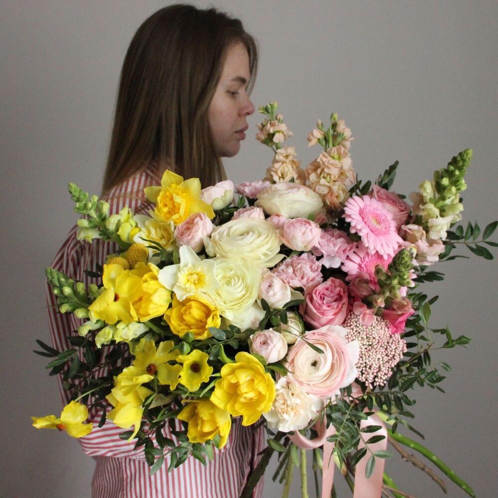 Тюльпан сортовой – 5 шт.Нарцисс – 5 шт.лютик ранункулюс – 3 шт.Роза кустовая пионовидная – 3 шт.Ранункулюс – 5 шт.Гвоздика – 7 шт.Озотамнус – 3 шт.Маттиола – 3 шт.Львиный зев – 5 шт.Краспедия – 3 шт.Эвкалипт – 5 шт.Лента – 2 шт.