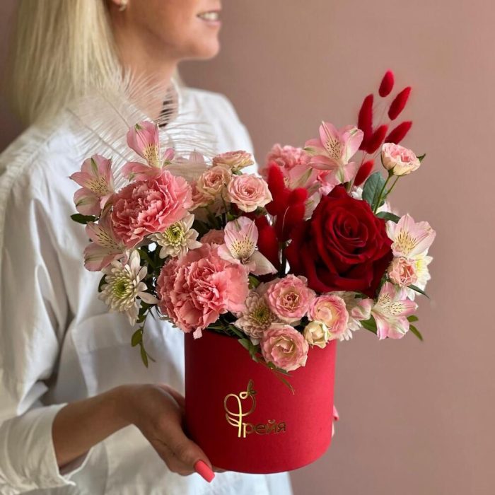 Альстромерия – 2 шт.Роза кустовая – 2 шт.Хризантема кустовая – 1 шт.Гвоздика – 3 шт.Фисташка – 2 шт.Роза Эксплорер – 1 шт.Коробка брендированная – 1 шт.Губка флористическая – 1 шт.лагурус пучок – 1 шт.