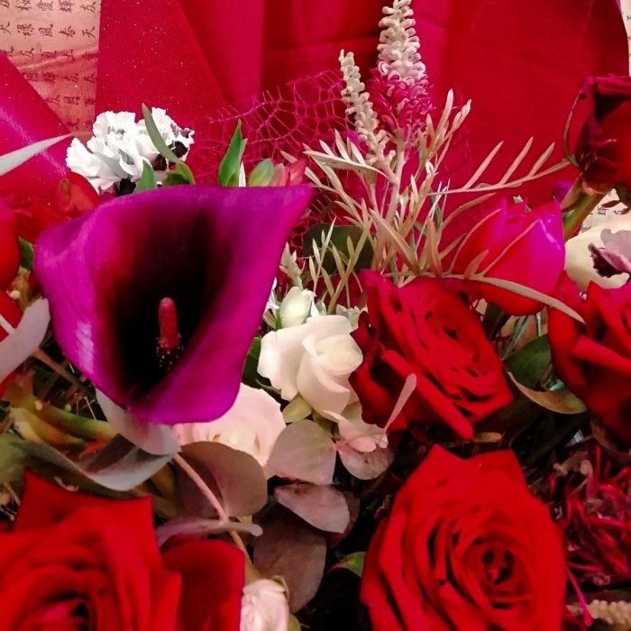 Калла – 2 шт.Кустовая роза – 3 шт.Красная роза – 5 шт.гривеллия – 3 шт.Эвкалипт – 3 шт.альстромертия – 3 шт.Гвоздика – 2 шт.