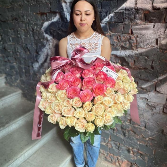 Корзина – 1 шт.Оазис – 3 шт.Роза – 101 шт.Лента – 2 шт.