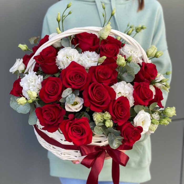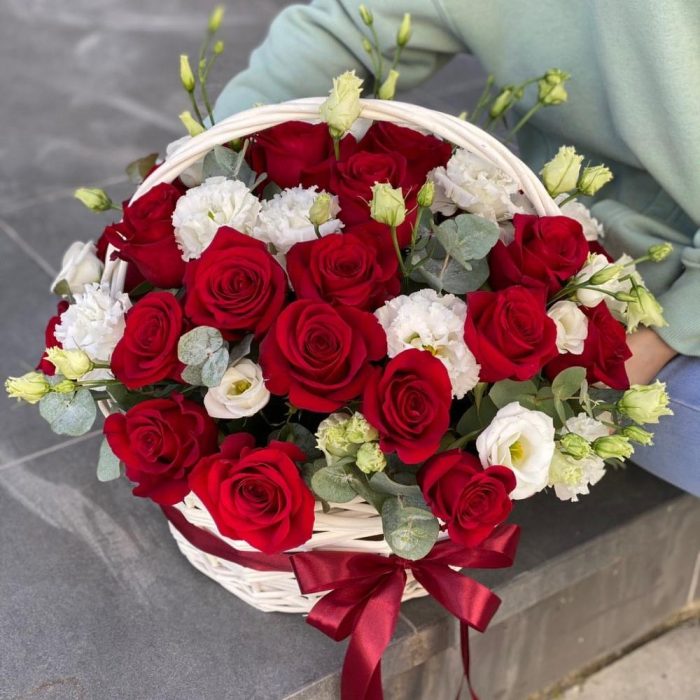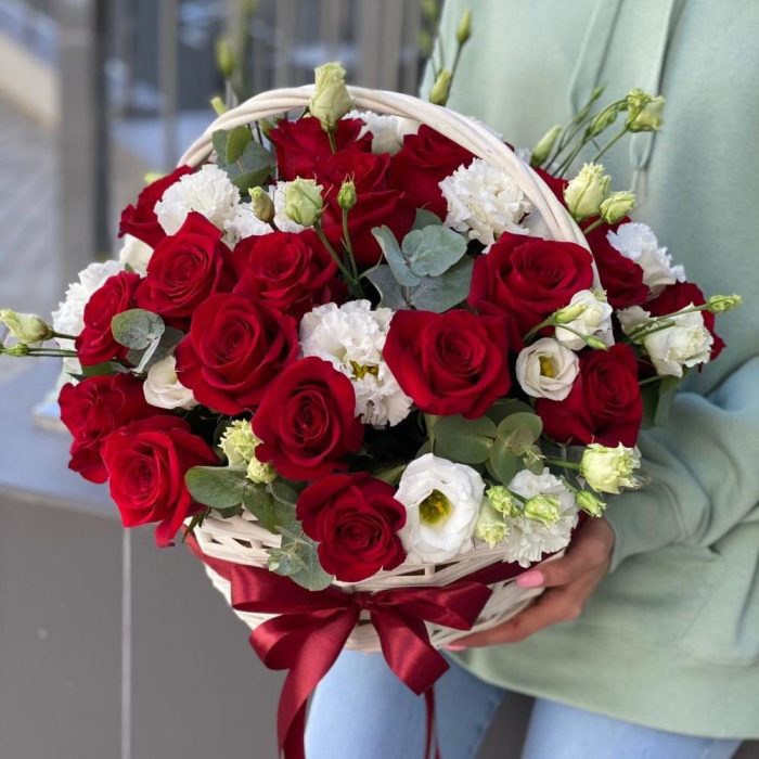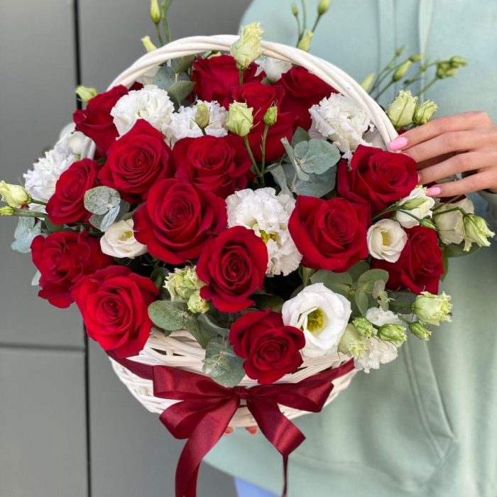 Корзина из красных роз, эустомы и эвкалипта !