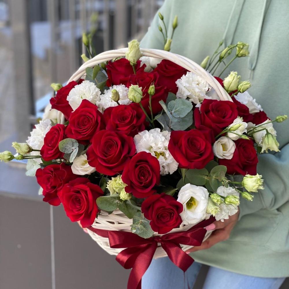 Корзина из красных роз и эустомы Аленький цветочек
