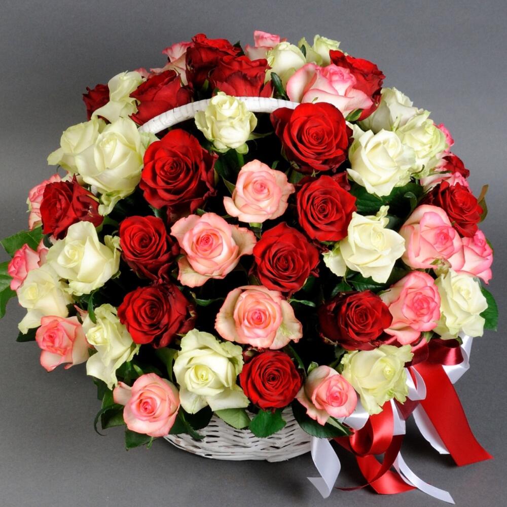 розы микс – 45 шт.Корзина плетеная – 1 шт.Оазис флористический – 2 шт.работа флориста – 1 шт.