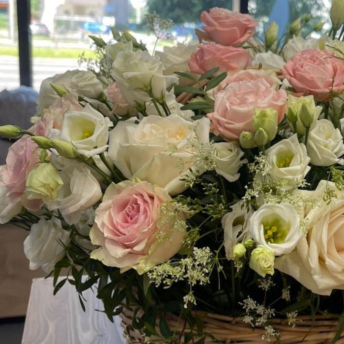 Роза Эквадор – 17 шт.Лента атласная – 2 шт.Фисташка – 7 шт.Корзина плетеная – 1 шт.Оазис флористический – 2 шт.эустома белая – 10 шт.Кустовая роза пионовидная – 10 шт.