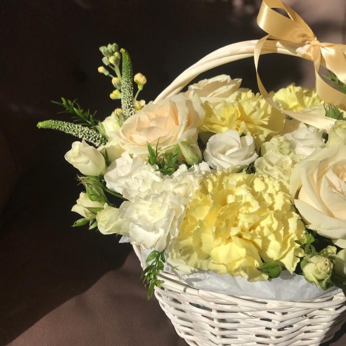 корзина 20 см – 1 шт.Губка флористическая – 1 шт.Роза кустовая – 3 шт.Лизиантус – 5 шт.Вероника – 3 шт.Маттиола – 2 шт.Аспарагус – 1 шт.Роза белая – 5 шт.Гвоздика – 7 шт.