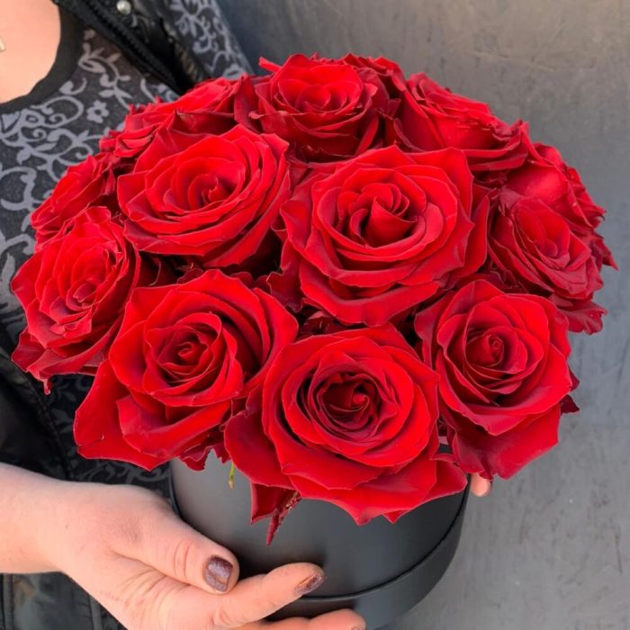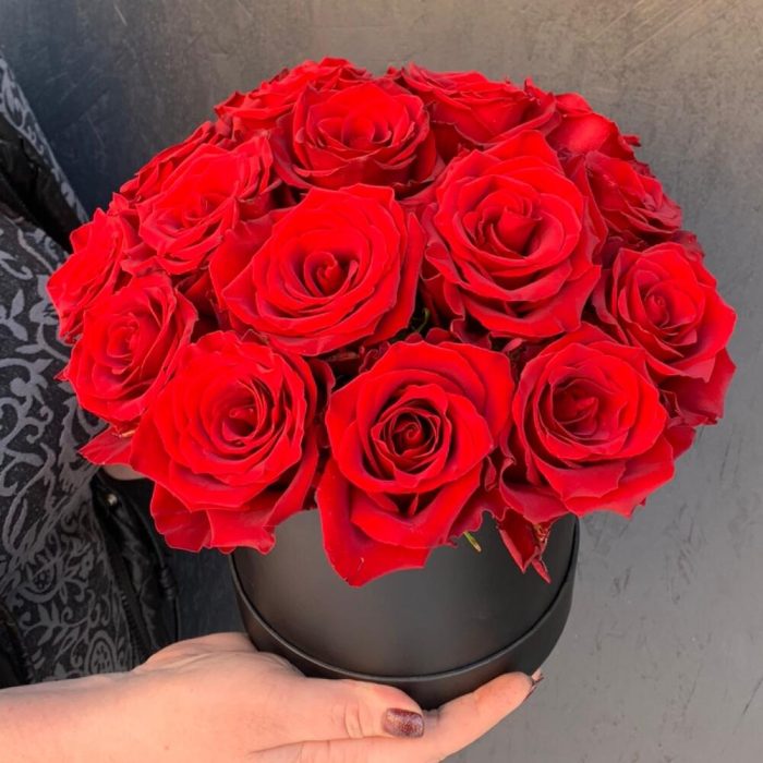 Роза красная – 19 шт.Оазис флористический – 1 шт.Шляпная коробка – 1 шт.