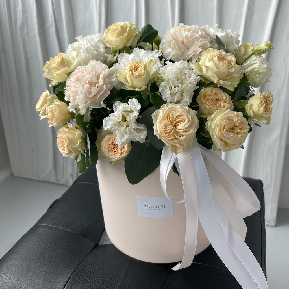 Роза садовая кустовая – 4 шт.Диантус – 5 шт.Эустома – 3 шт.Эвкалипт – 5 шт.Оазис флористический – 1 шт.Шляпная коробка – 1 шт.Лента атласная – 2 шт.наклейка фирменная – 1 шт.