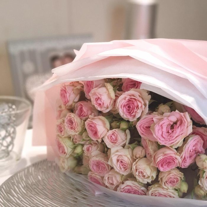 Лента атласная – 1 шт.Роза кустовая пионовидная – 7 шт.Пленка матовая – 1 шт.Открыточка с вашими пожеланиями – 1 шт.Тишью белое – 4 шт.любовь флориста (бесплатно) – 1 шт.
