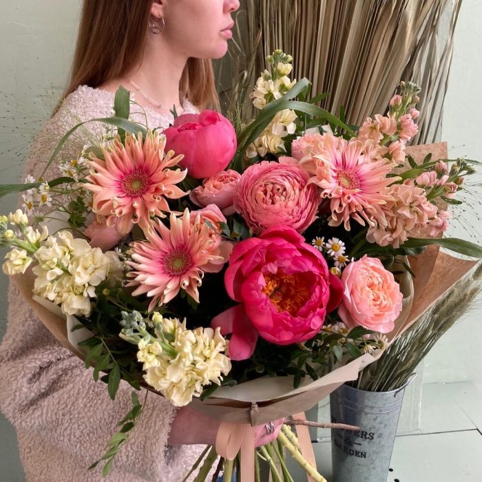 Пион – 2 шт.Роза кустовая пионовидная – 1 шт.матилла – 5 шт.гербера кучерявая – 3 шт.паникум грас – 3 шт.Ромашка кустовая – 2 шт.Фисташка – 3 шт.Упаковка дизайнерская – 1 шт.Лента атласная – 1 шт.
