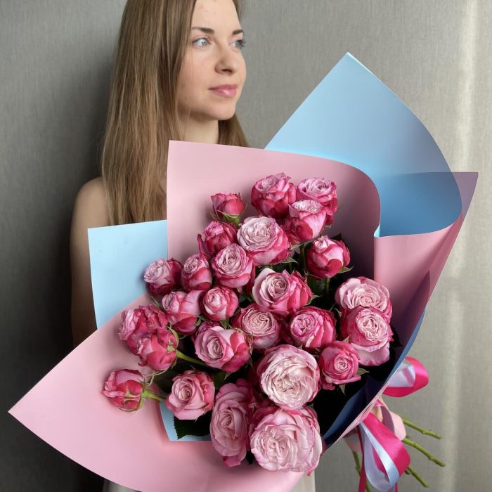 Кустовая роза – 7 шт. Упаковка – 1 шт. Атласная лента – 1 шт.