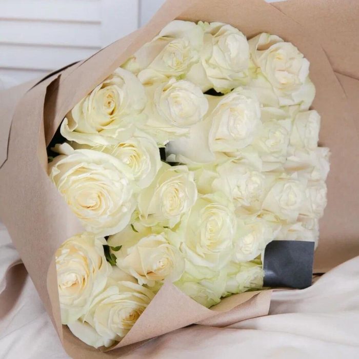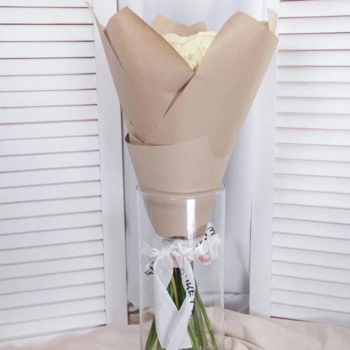роза mondial 60 см – 25 шт.Крафт упаковка – 1 шт.Лента атласная – 1 шт.
