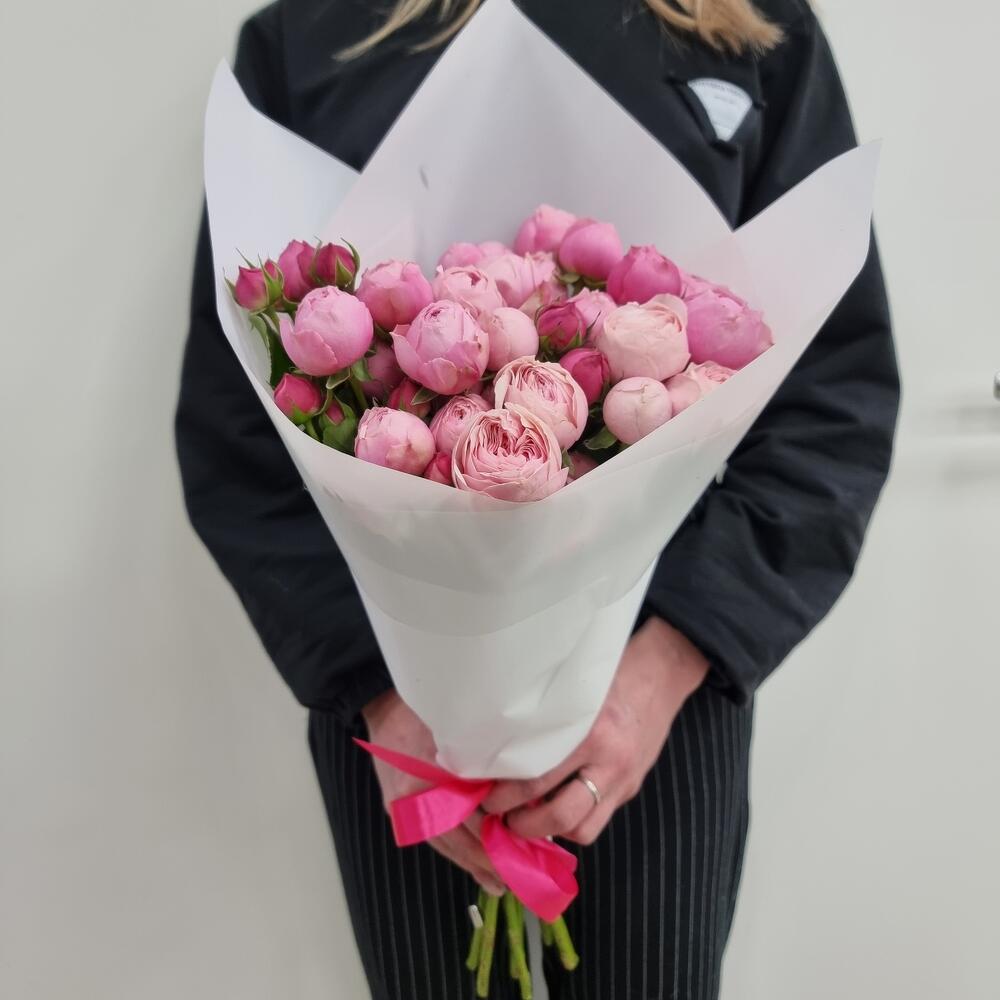 Небольшой букет из 5-ти пионовидных розочек в матовой плёнке для подарка на любой повод или просто так.