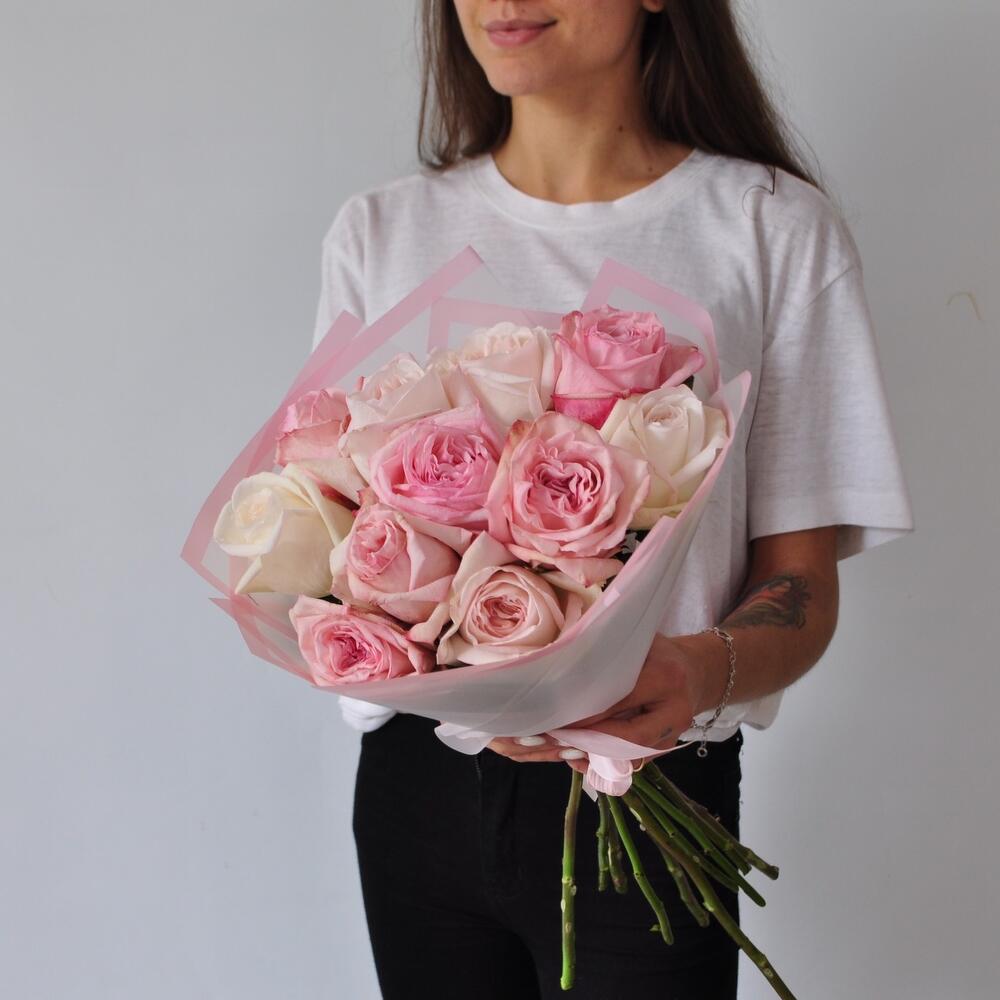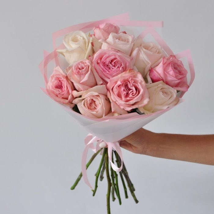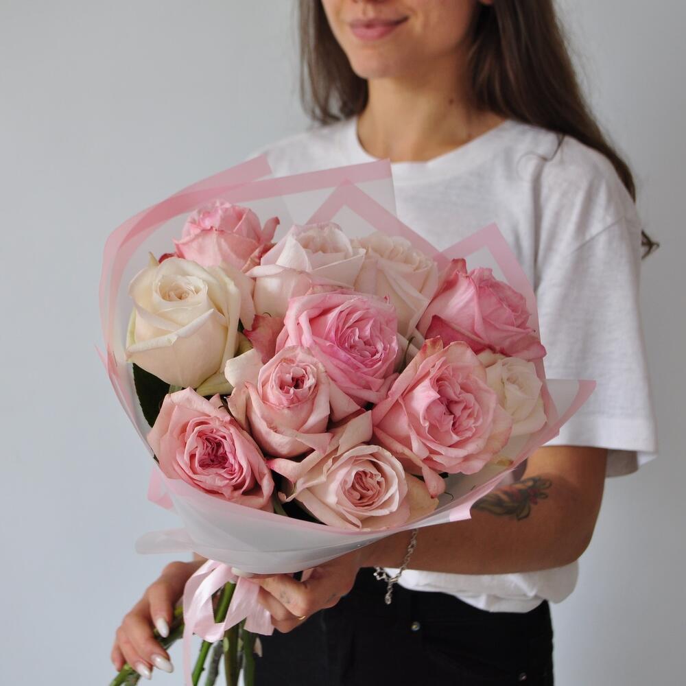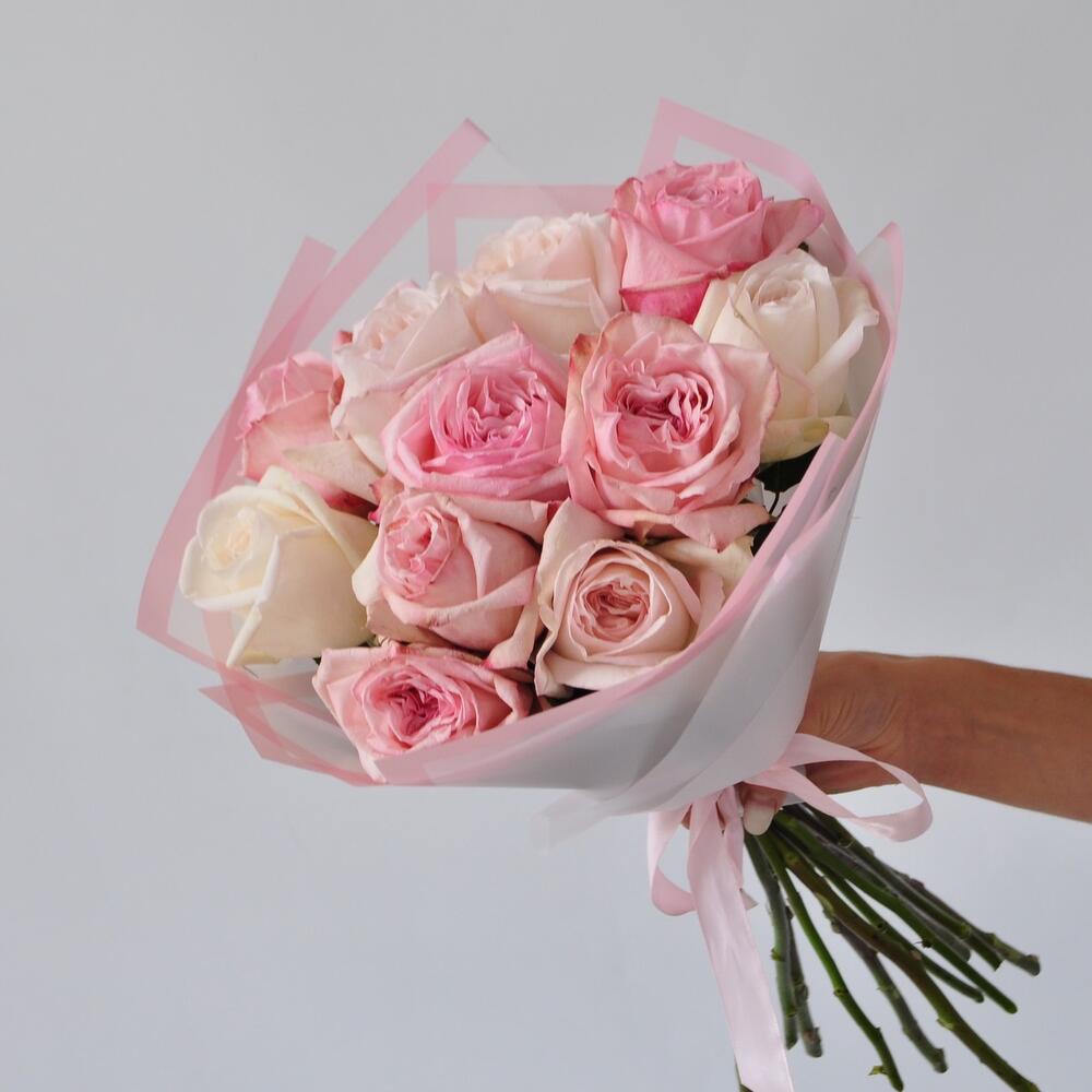 пионовидные розы охара – 11 шт.Пленка матовая – 1 шт.Лента атласная – 1 шт.