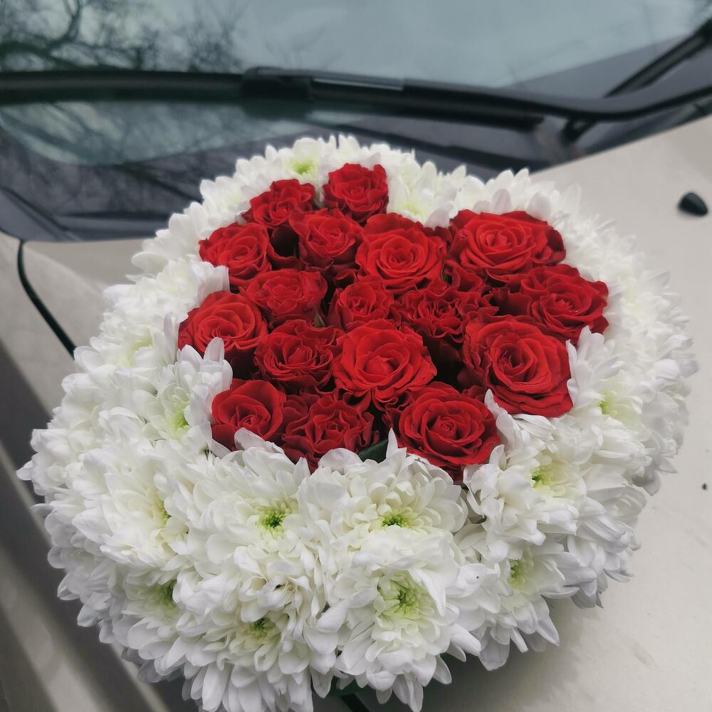 Яркое сердце из 17 красных роз и 4 веток белоснежной хризантемы. Очень нежный и привлекательный букет в форме сердца.
