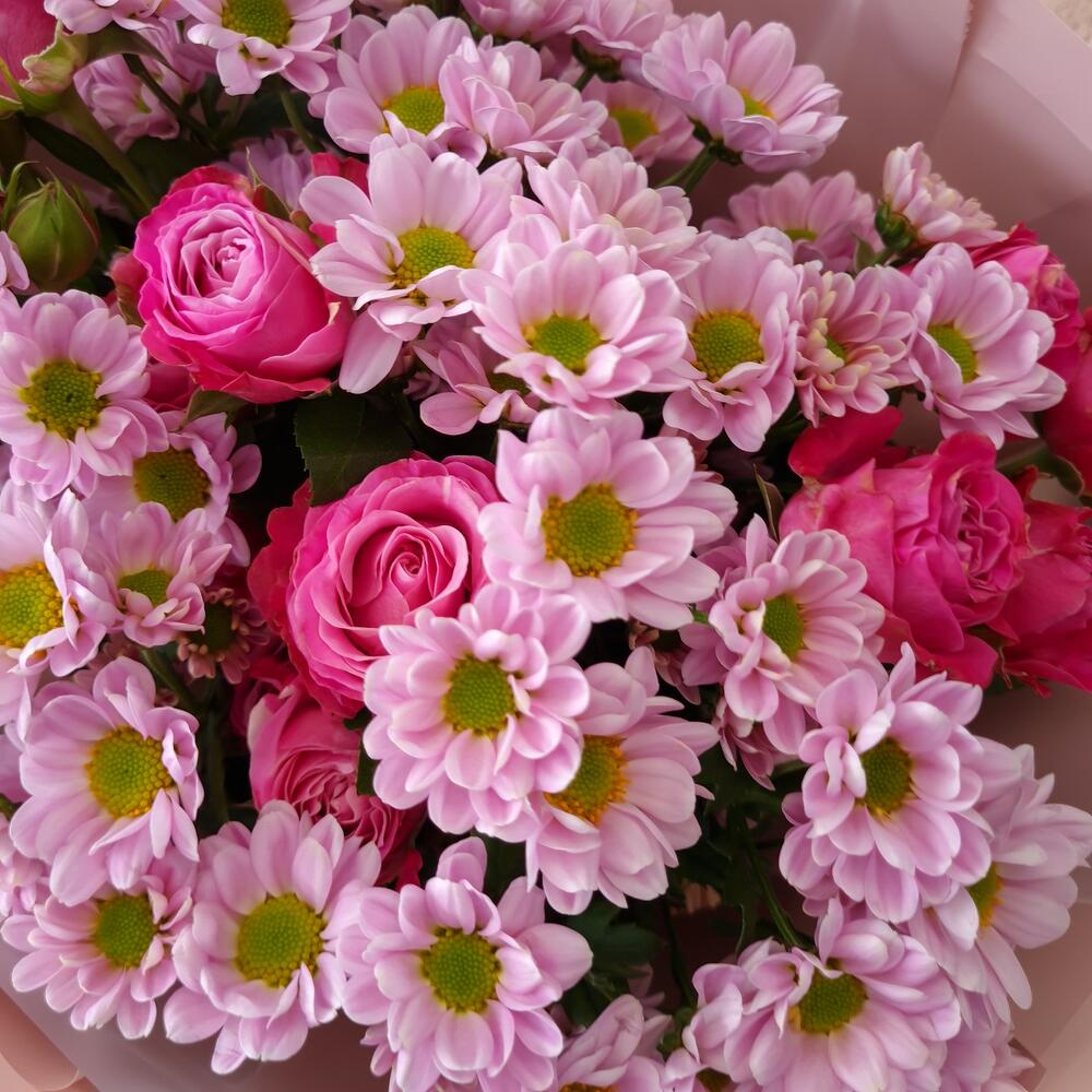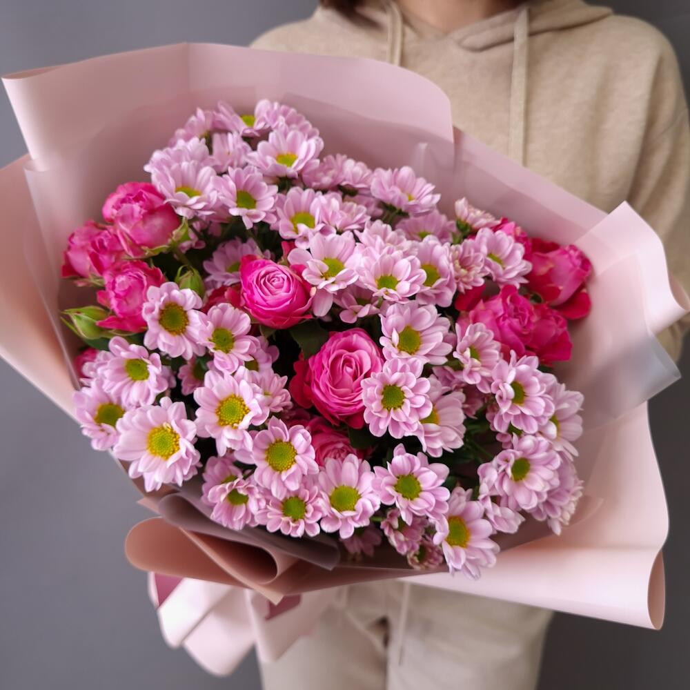 Букет из розовых гвоздик, пионовидных роз, эустом