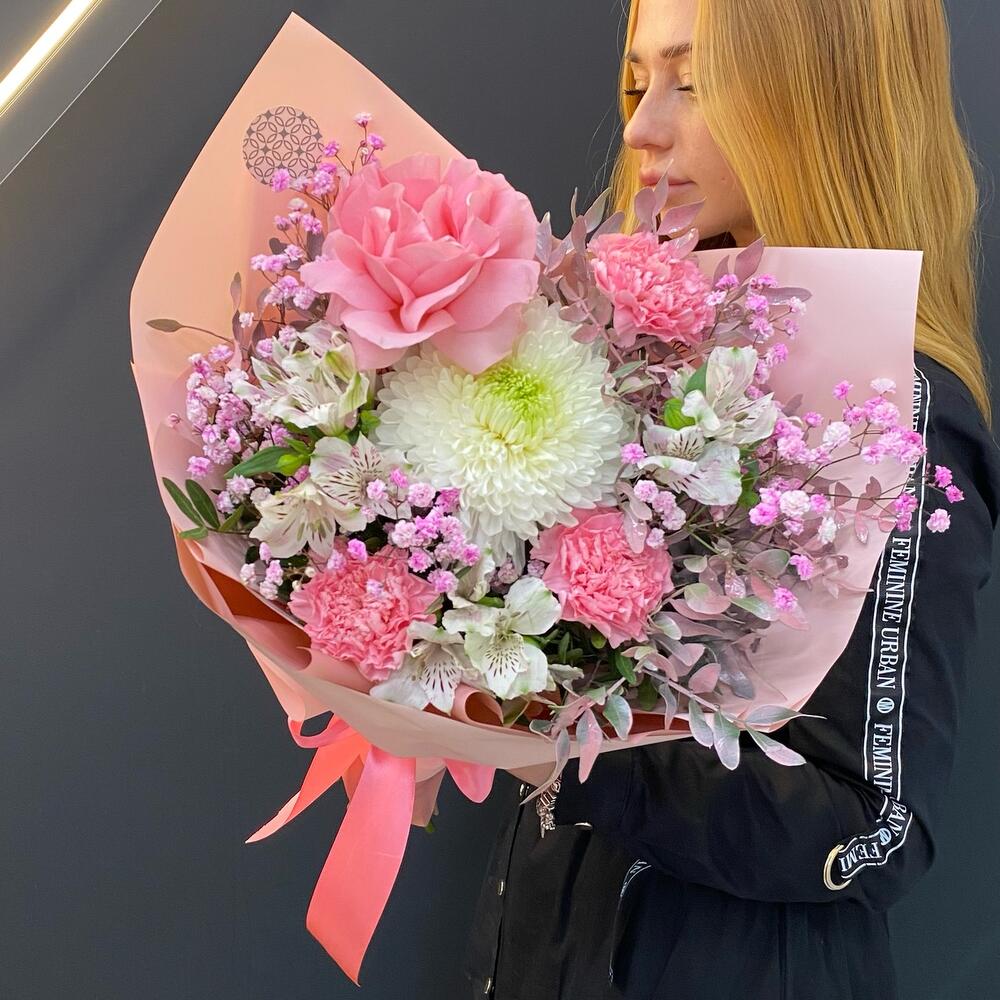 Альстромерия – 5 шт.Гипсофила – 3 шт.Хризантема – 1 шт.Роза Эквадор – 1 шт.Гвоздика – 3 шт.