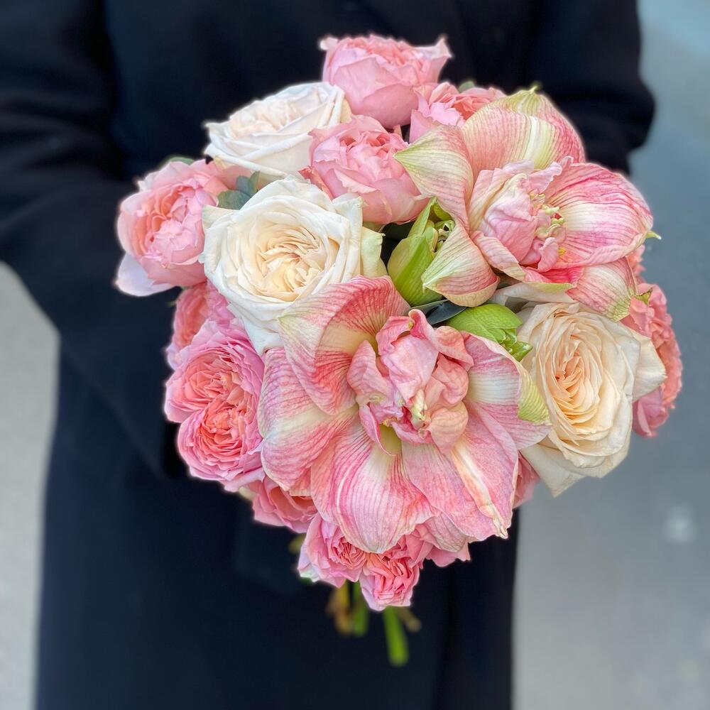 Альстромерии, Гвоздики, Кустовые розы, Лизиантусы, Розы, Хризантемы