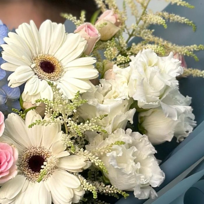 Астильба – 1 шт. Гортензия – 1 шт. Кустовая роза – 2 шт. Эустома – 1 шт. Гербера – 2 шт.