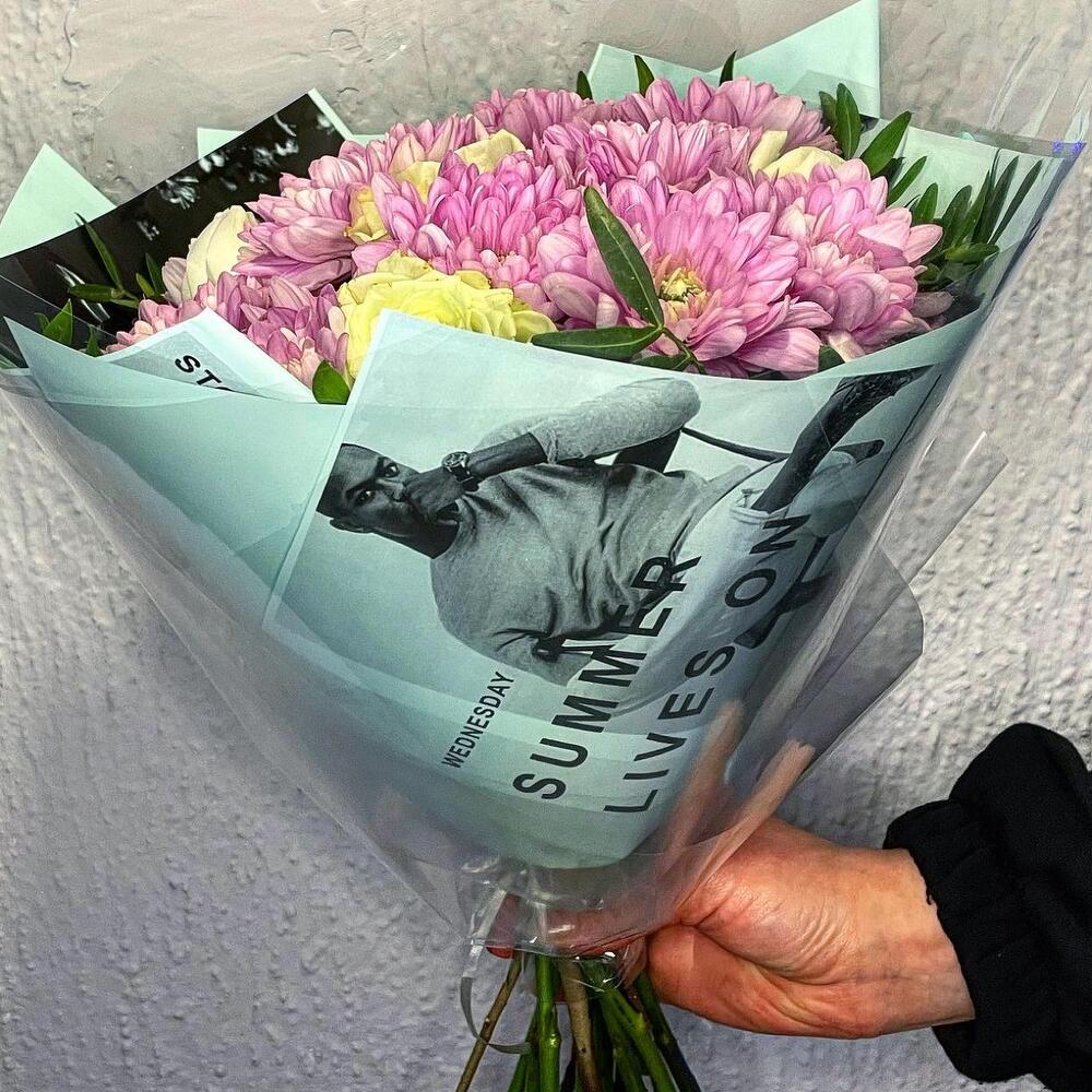 Хризантема кустовая – 4 шт.Роза Эквадор – 5 шт.фисташка зелень – 4 шт.Упаковка дизайнерская – 2 шт.